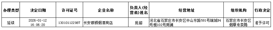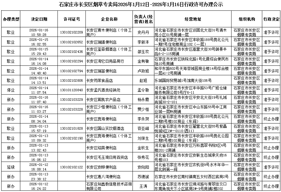 石家庄市长安区烟草专卖局2026年1月12日-2026年1月16日行政许可办理公示