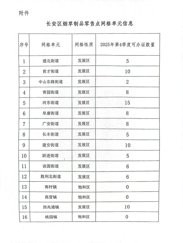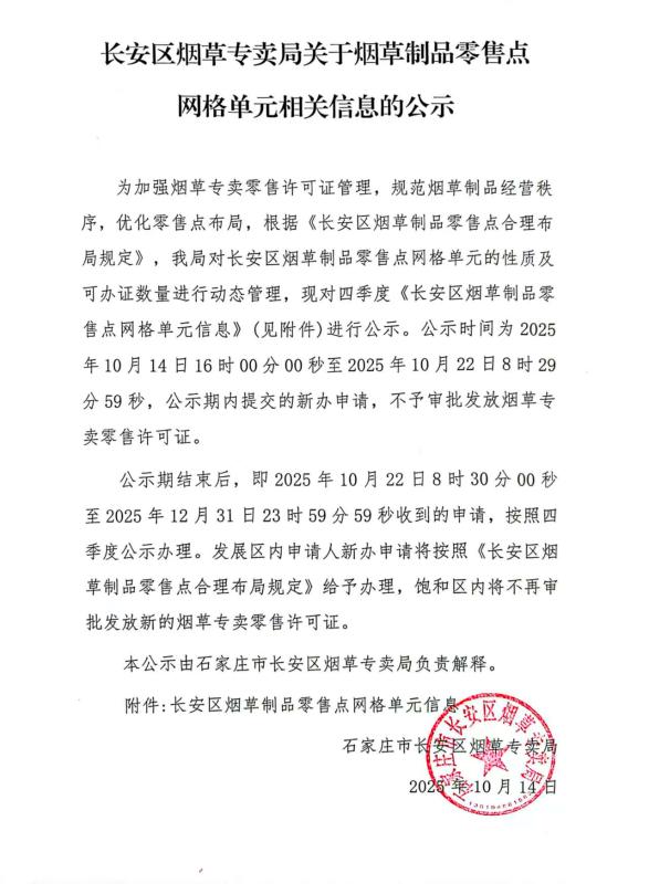 长安区烟草专卖局关于烟草制品零售点网格单元相关信息的公示(2025年4季度)