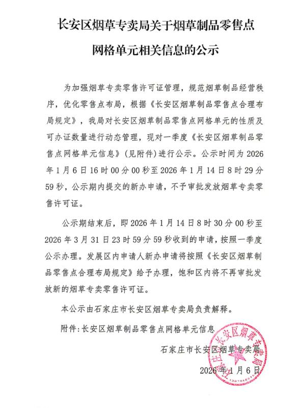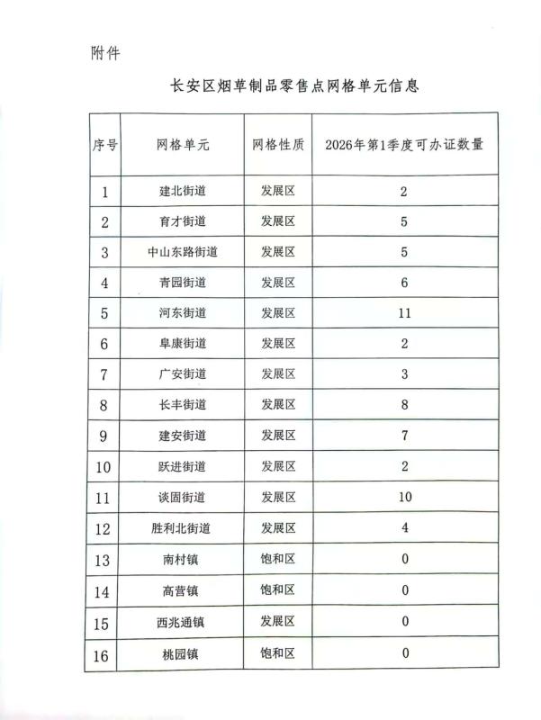长安区烟草专卖局关于烟草制品零售点网格单元相关信息的公示