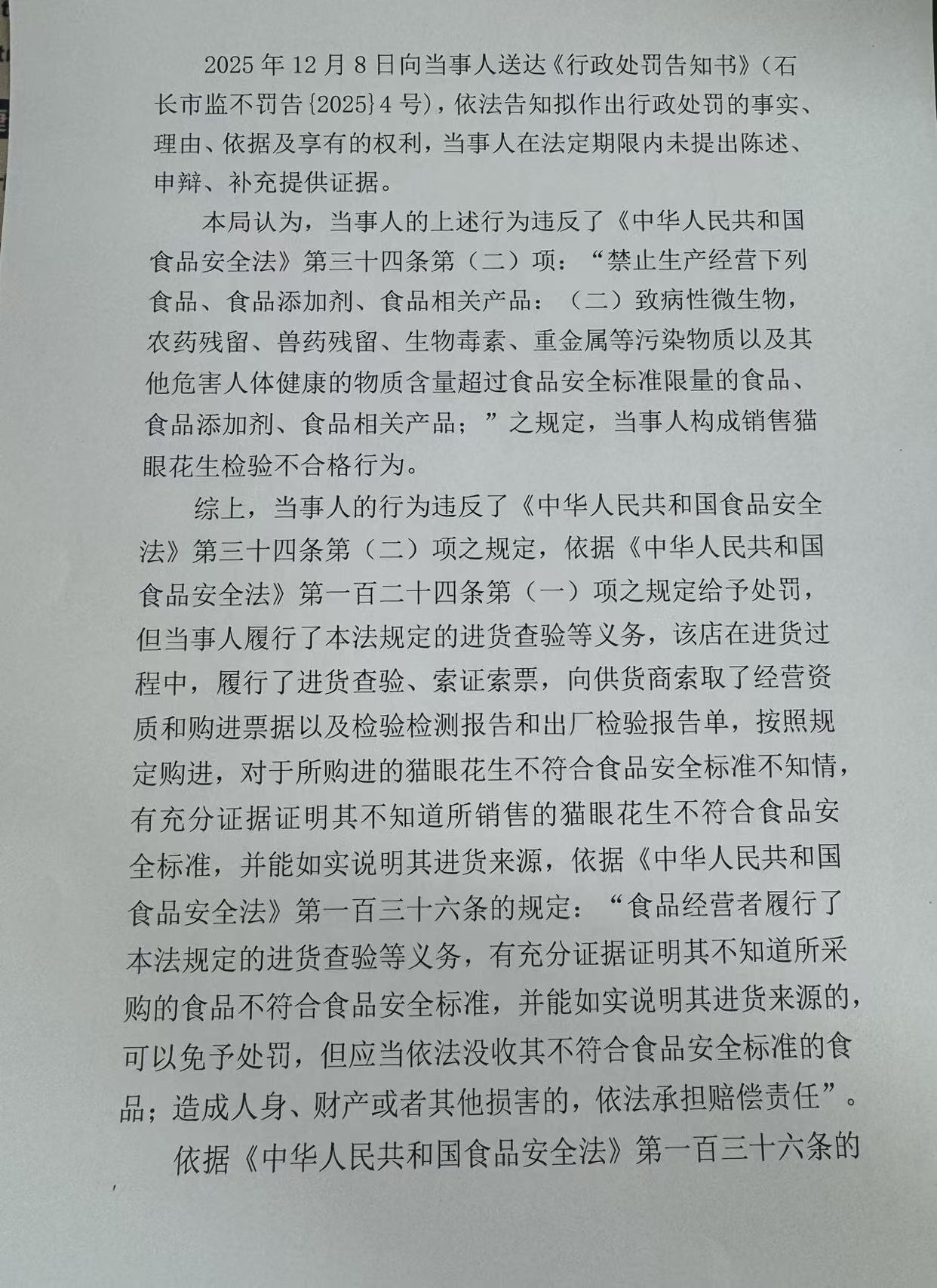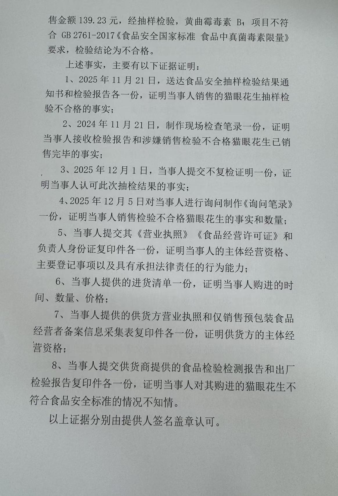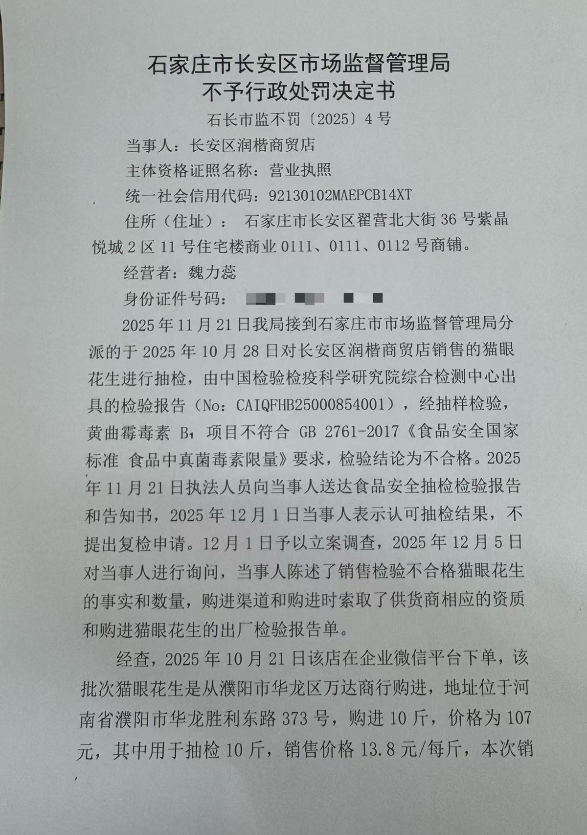 长安区润楷商贸店(魏力蕊)销售猫眼花生检验不合格案