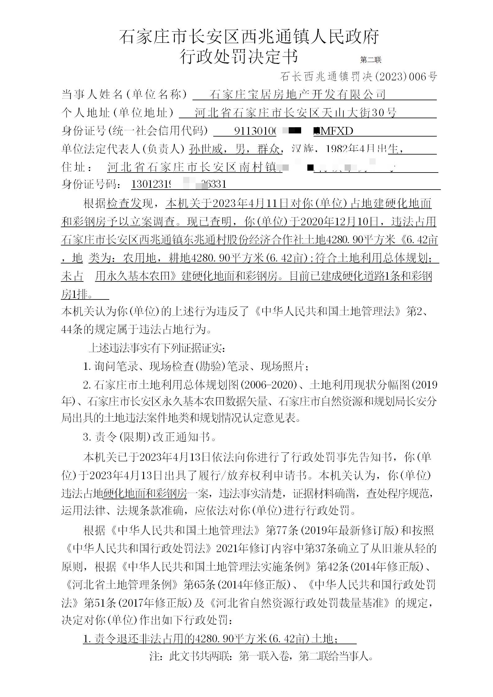 石家庄宝居房地产开发有限公司违法占地建硬化地面和彩钢房案