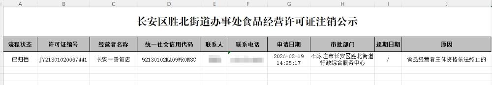 长安一善饭店食品经营许可证注销公示