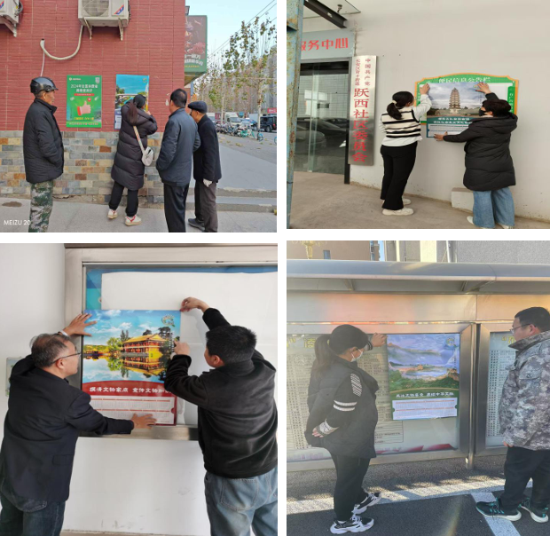 按照省、市文物局统一安排,省文物局精心制作了大量第四次全国文物普查宣传海报。长安区根据辖区面积大、人口多的实际情况,全区16个镇、街道深入各个社区(村),发放、张贴宣传海报,吸引居民驻足观看和了解文物普查的相关政策、知识,营造了全民知晓、全民参与的社区氛围。