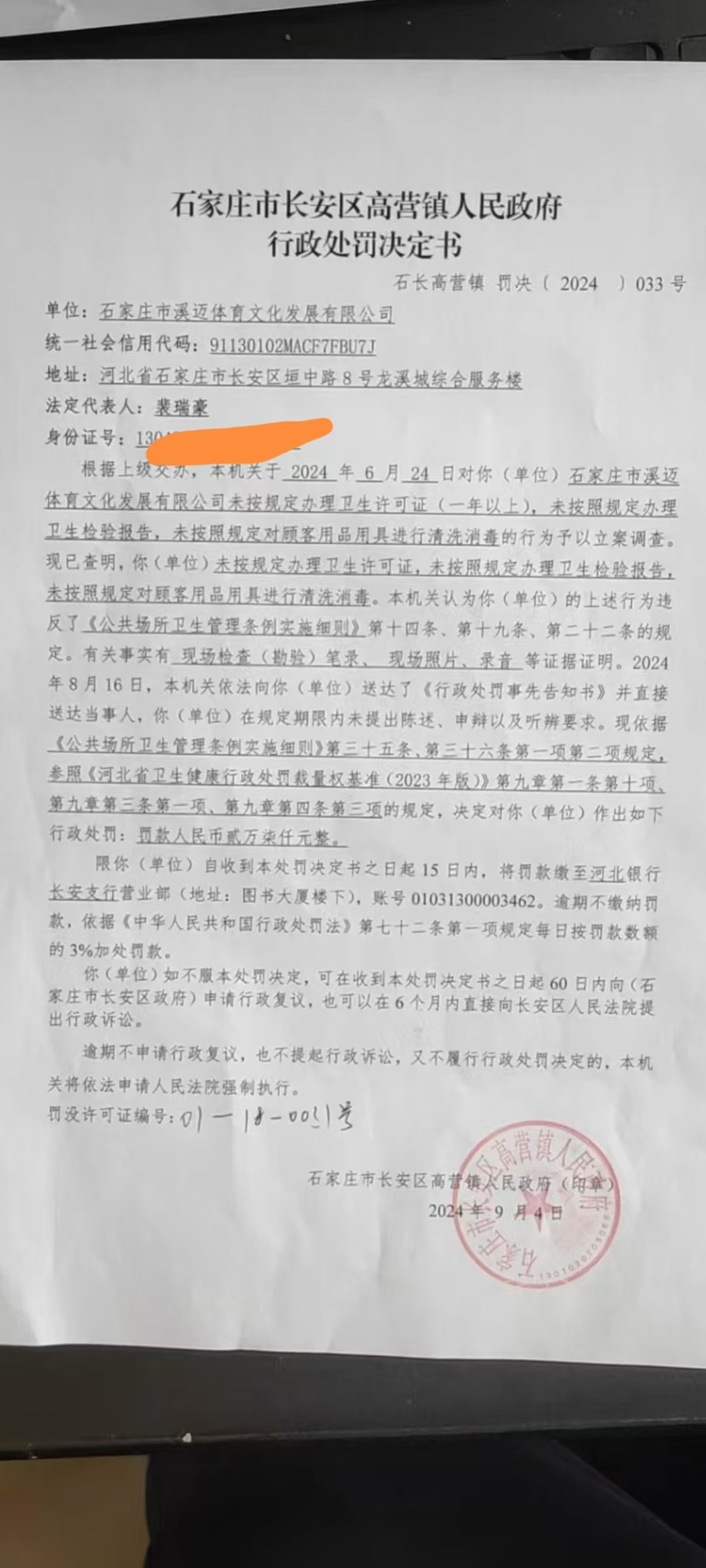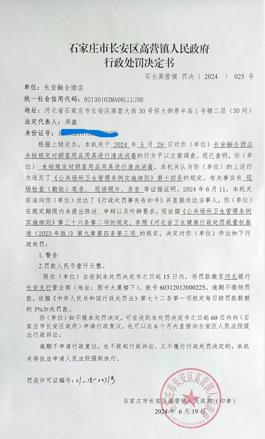 石家庄市溪迈体育文化发展有限公司未按照规定对顾客用品用具进行清洗消毒案