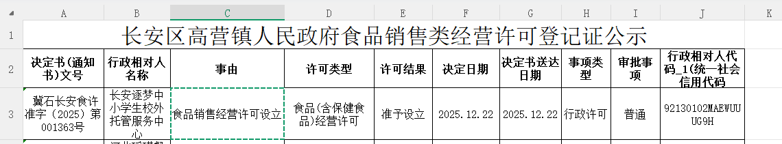 长安逐梦中小学生校外托管服务中心食品销售经营许可设立